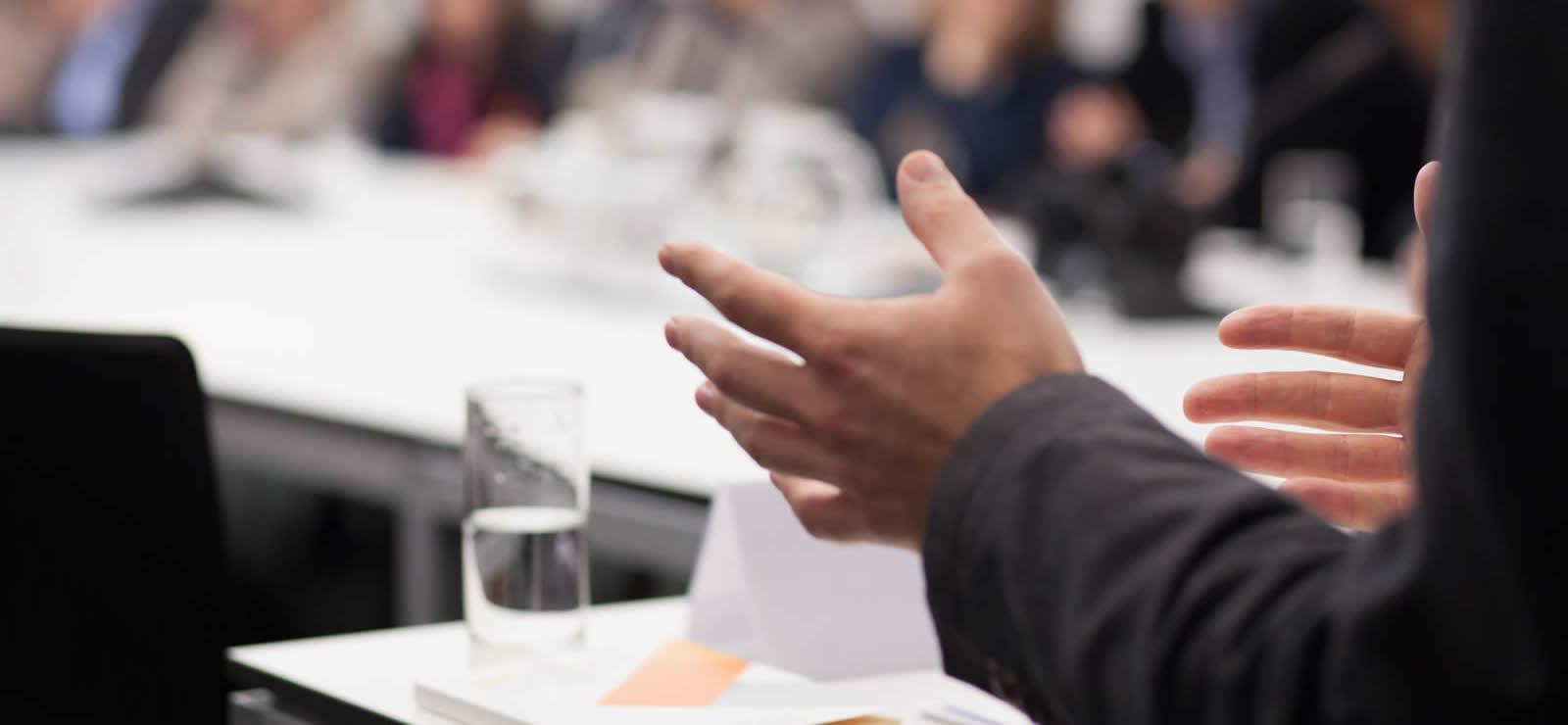 Die Kamera befindet sich hinter einer Person: Der Fokus liegt auf zwei Hände, die gerade gestikulieren. Im Hintergrund sind verschwommen viele Menschen und Tische sichtbar. Es findet offenbar eine Besprechung statt.
